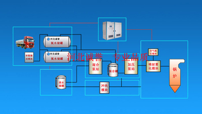 液體罐車運送濃度20%-30%的氨水至水泥廠,泵送到儲存罐中供脫硝使用。脫硝時,氨水經(jīng)泵站加壓稀釋后,通過管道輸送到脫硝噴槍的脫硝噴頭內(nèi),氨水溶液經(jīng)過脫硝噴頭霧化后直接噴入水泥窯尾分解爐內(nèi),氨氣與NOX反應(yīng)后生成氮氣直接排..